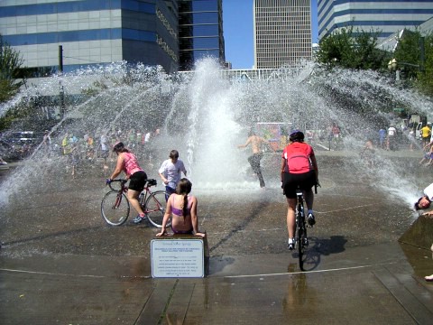 Kari and Heather stopping by the Salmon St Fountain